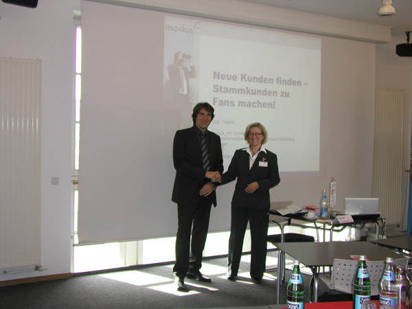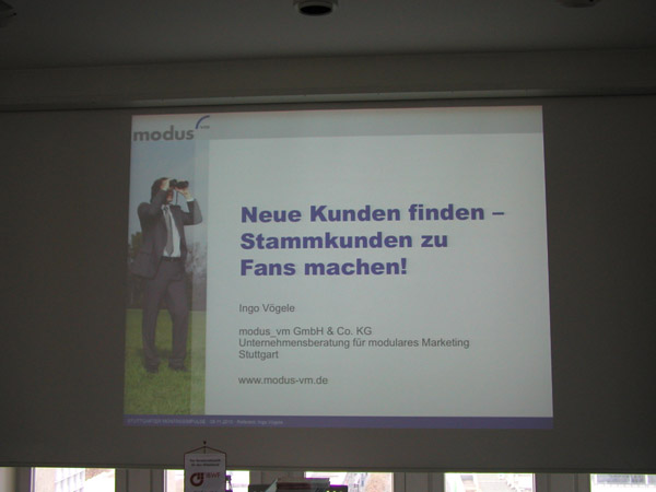 Am Montag, den 08. November 2010, war es an Ingo Vögele, geschäftsführender Gesellschafter der modus_vm Unternehmensberatung für modulares Marketing, mit dem Thema „Neue Kunden finden – Stammkunden zu Fans machen“ die Veranstaltungsreihe STUTTGARTER MONTAGSIMPULSE erfolgreich fortzusetzen.