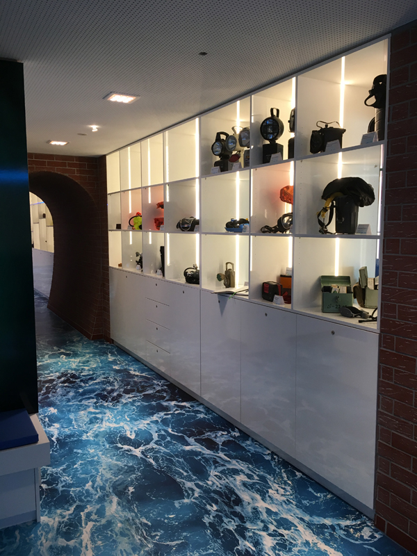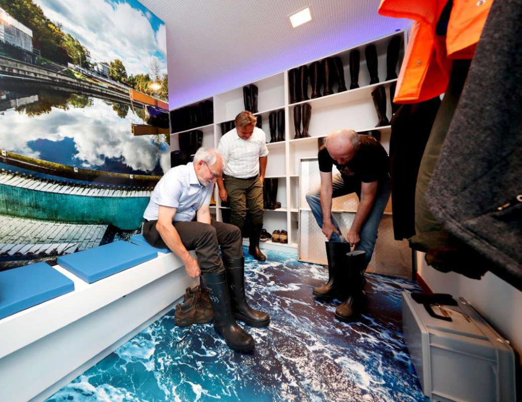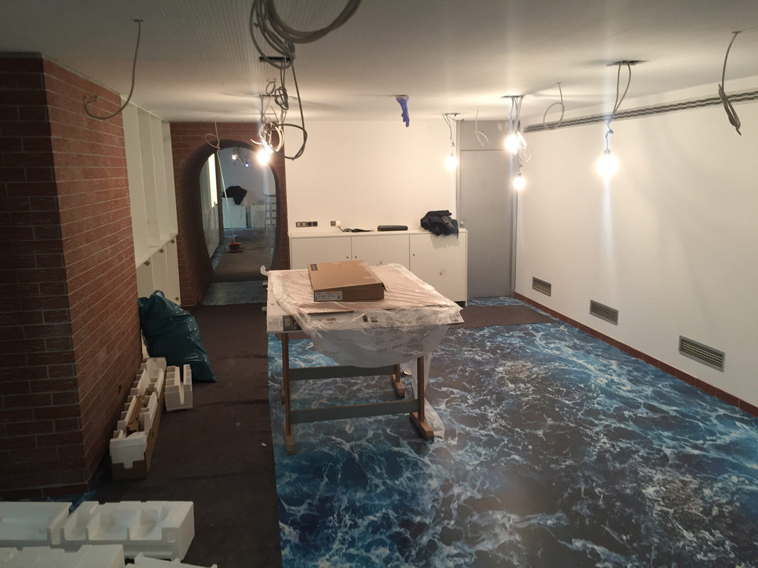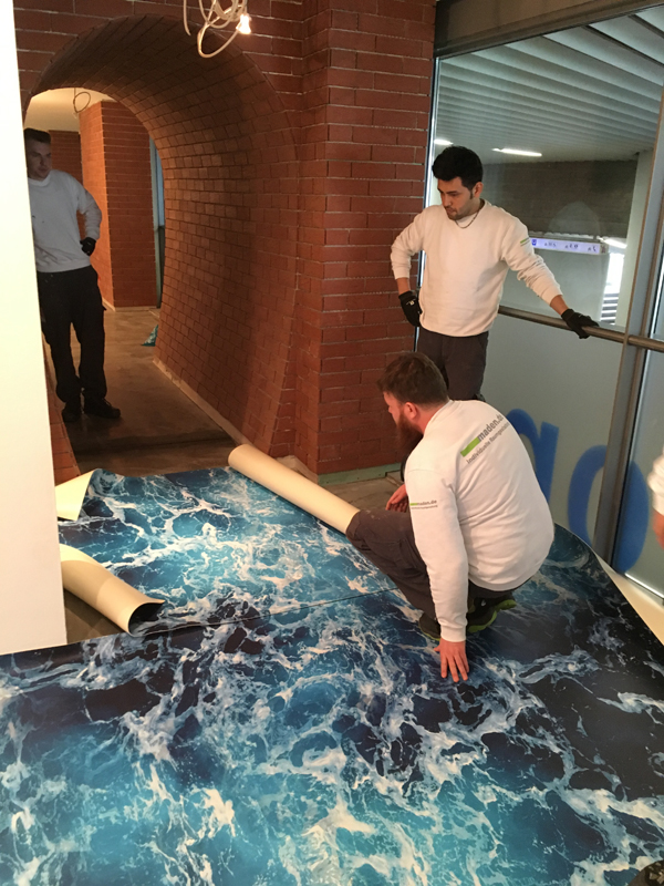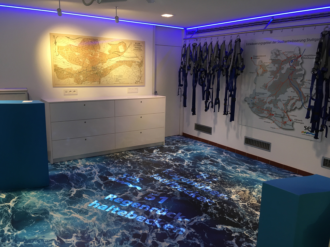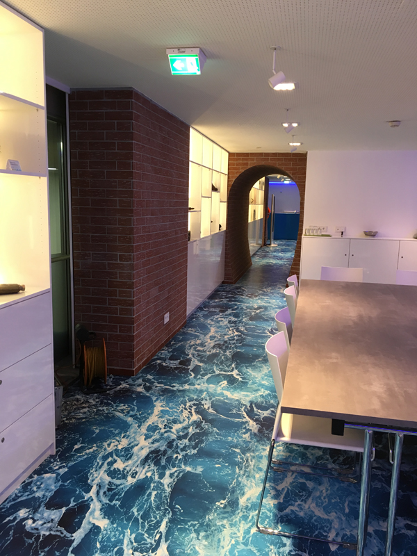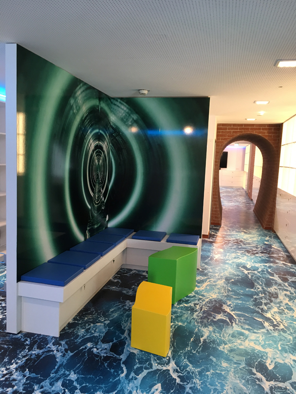 - geklinkerte Trockenbauwände und mit Wasseroptik bedruckter Fußboden für echtes „Kanalfeeling“