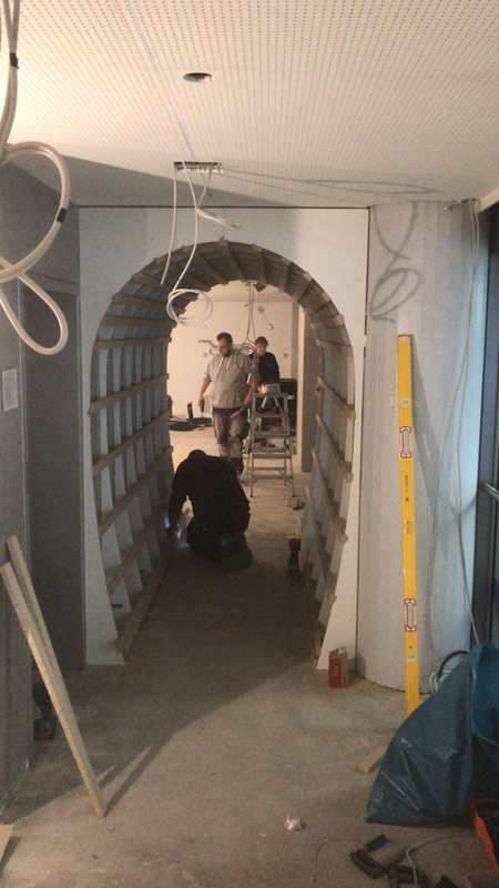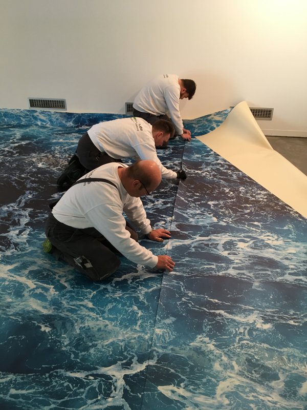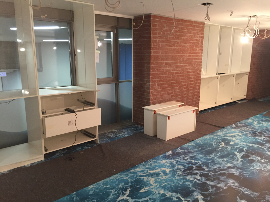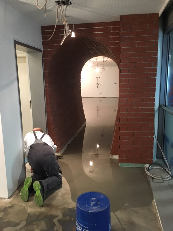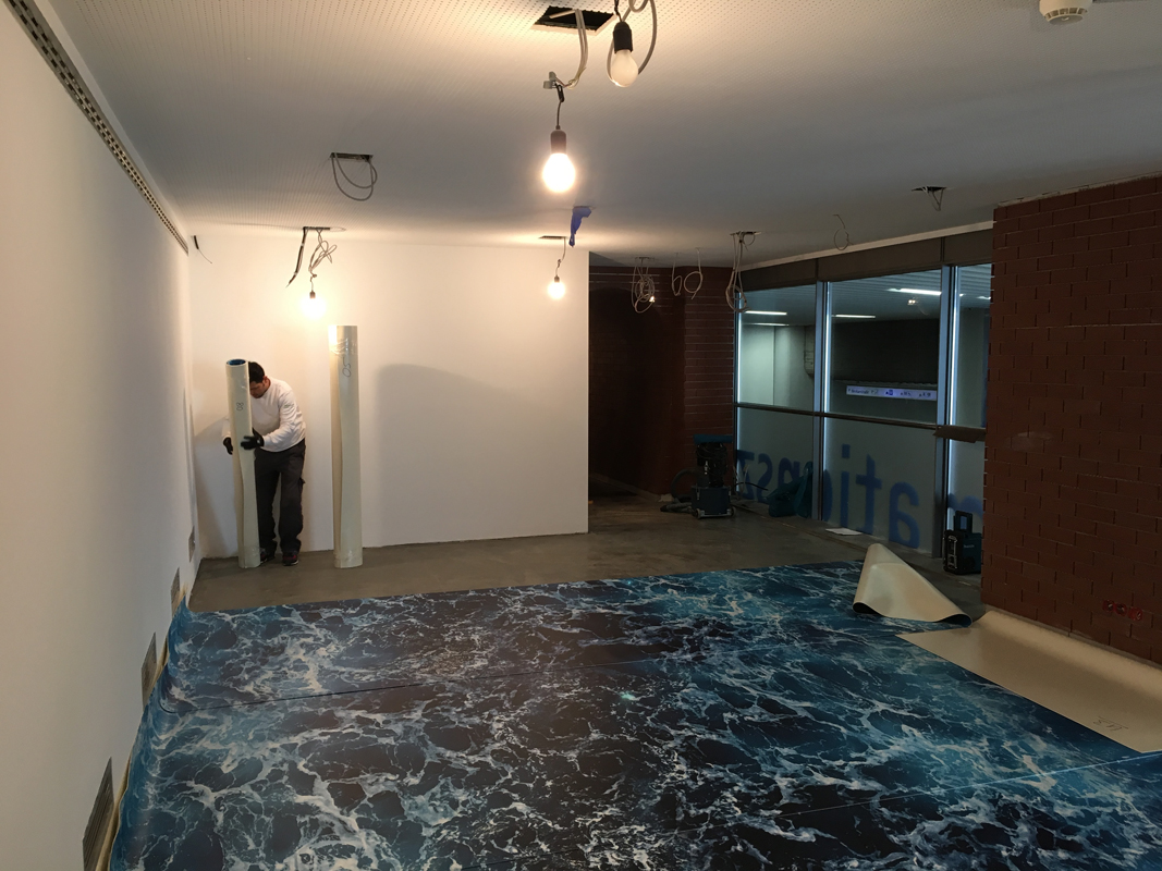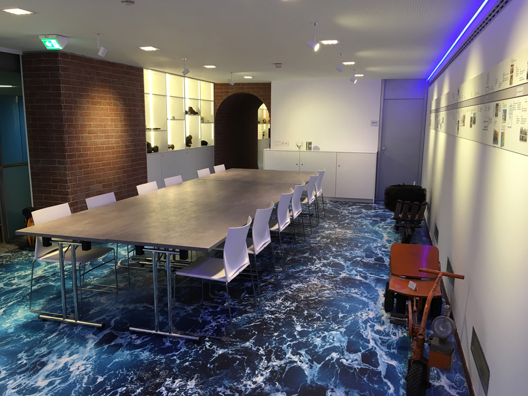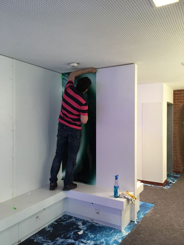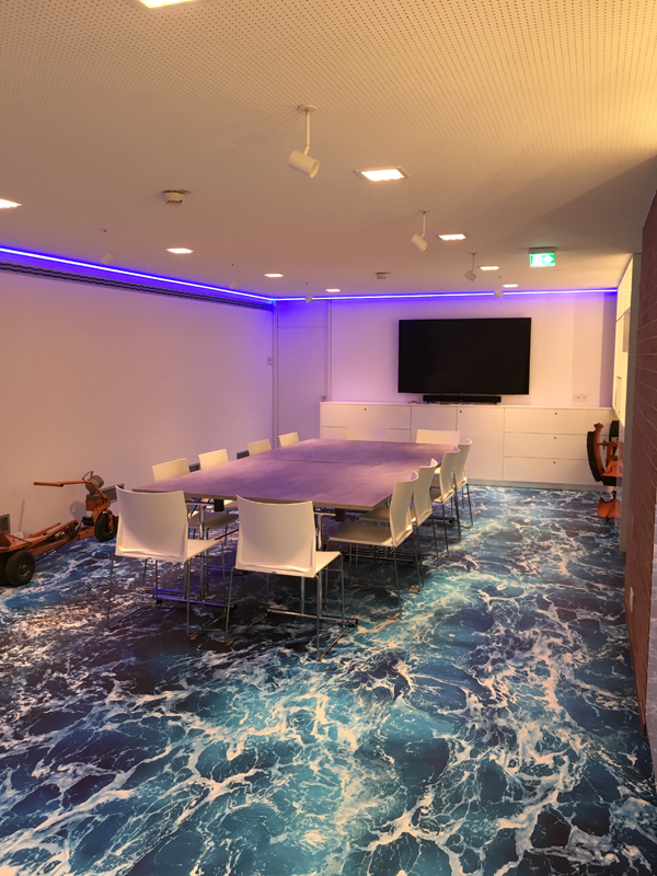 - geklinkerte Trockenbauwände und mit Wasseroptik bedruckter Fußboden für echtes „Kanalfeeling“