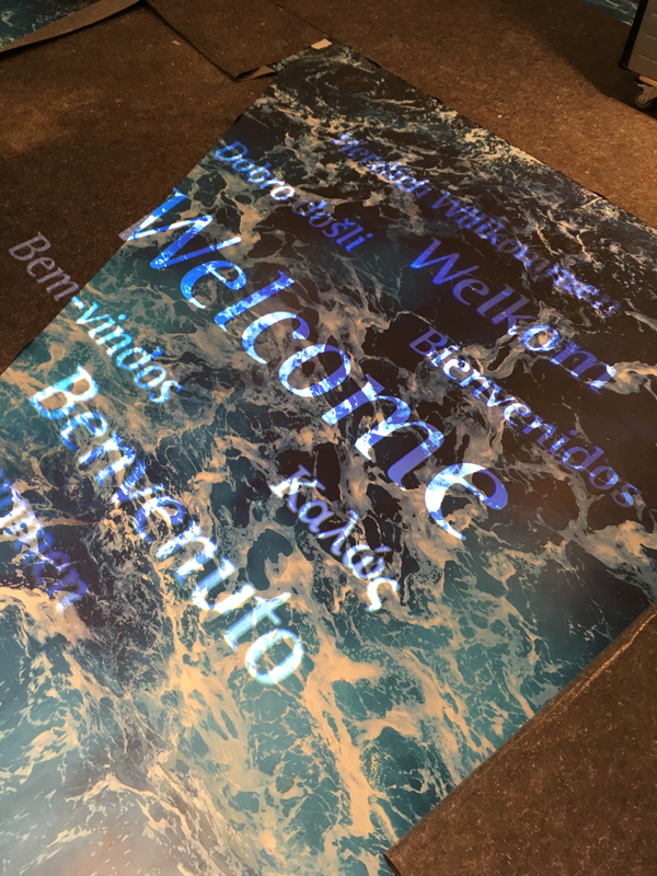 - Gobo-Projektor, der wichtige Kennzahlen und Kernaussagen der SES auf den Boden strahlt