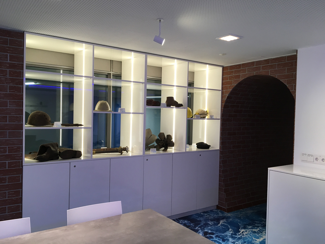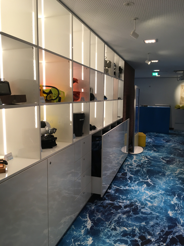 - komplettes Möbelsystem mit flexiblen beleuchteten Fächern für die Exponate und abschließbarem Stauraum für die verschiedenen Raumnutzungen